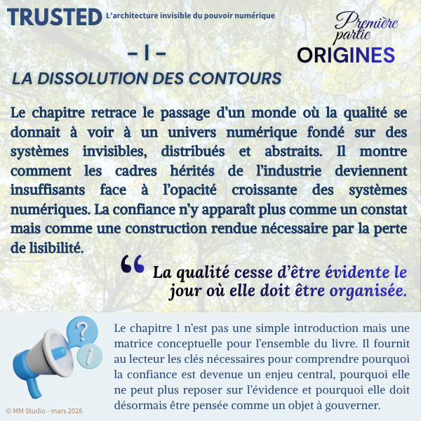 Ce premier chapitre ne se limite pas à retracer l’histoire de la qualité industrielle. Il constitue le socle conceptuel de l’ouvrage. Il montre comment, face à la complexité croissante des systèmes productifs puis numériques, les organisations ont progressivement dû apprendre à faire confiance sans voir en déplaçant leurs cadres de jugement, leurs instruments de contrôle et leurs dispositifs de preuve.