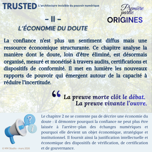 Le chapitre 2 constitue une première charnière de l’ouvrage. Il ne se contente pas de décrire une économie du doute : il démontre pourquoi la confiance ne peut plus être laissée à l’arrière-plan des échanges numériques et pourquoi elle devient un objet économique, stratégique et institutionnel. Il fournit ainsi la justification intellectuelle et économique des dispositifs de vérification, de certification et de gouvernance qui seront analysés dans les chapitres suivants.