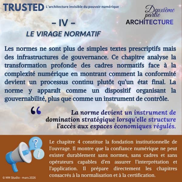 Ce chapitre marque une inflexion décisive dans l’ouvrage. Après avoir établi les fondements conceptuels de la confiance (chapitre 1), montré son basculement économique (chapitre 2) et décrit les méthodes permettant de vérifier l’invisible (chapitre 3), il démontre que la norme est devenue la colonne vertébrale institutionnelle du numérique.