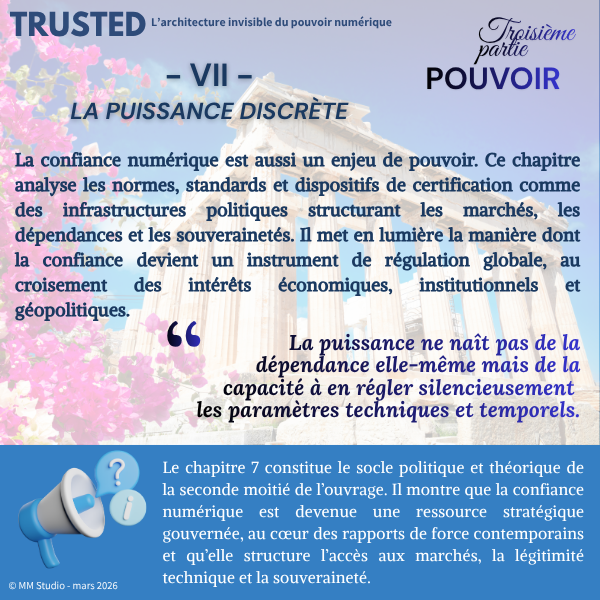 Le chapitre 7 constitue le socle politique et théorique de la seconde moitié de l’ouvrage. Il montre que la confiance numérique est devenue une ressource stratégique gouvernée, au cœur des rapports de force contemporains et qu’elle structure l’accès aux marchés, la légitimité technique et la souveraineté. Il ouvre directement la voie aux chapitres suivants, consacrés aux acteurs concrets, aux architectures futures et aux modèles de gouvernance mondiale de la confiance.