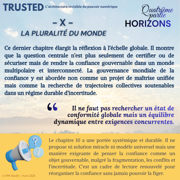 Le chapitre 10 donne à TRUSTED sa portée systémique et durable. Il ne propose ni solution miracle ni modèle universel mais une manière exigeante de penser la confiance comme un objet gouvernable, malgré la fragmentation, les conflits et l’incertitude. Il transforme l’ouvrage en un cadre de lecture pour les décideurs, les institutions et les praticiens appelés à organiser la confiance sans jamais pouvoir la figer.